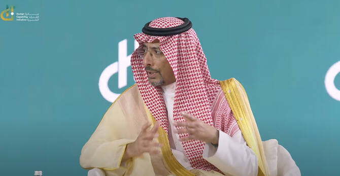 Saudi Minister of Industry and Mineral Resources Bandar Alkhorayef speaks in a fireside chat on the first day of the Human Capability Initiative 2025 taking place in Riyadh